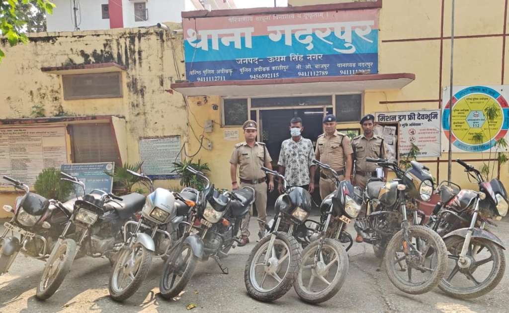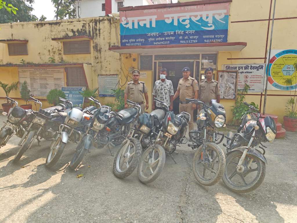 *रुद्रपुर। वरिष्ठ पुलिस अधीक्षक ऊधमसिंहनगर मणिकांत मिश्रा के अपराधियों के विरुद्ध सख्त रुख और जनपद में वाहन चोरी के मामलों पर प्रभावी अंकुश लगाने के निर्देशों के क्रम में थाना गदरपुर पुलिस को बड़ी सफलता हाथ लगी है। पुलिस टीम ने सघन चेकिंग अभियान चलाते हुए एक शातिर वाहन चोर दीपक उर्फ साबी को चोरी की 08 मोटरसाइकिलों के साथ गिरफ्तार किया है। बरामद मोटरसाइकिलों में जनपद उधमसिंहनगर के विभिन्न थानों सहित उत्तर प्रदेश राज्य से चोरी की गई मोटरसाइकिलें भी शामिल हैं।